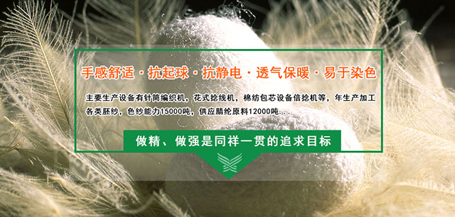 公司所属企业始建于1999年,目前,公司拥有二个生产企业,二家外贸公司,二家内贸公司,主要生产设备有针筒编织机,花式捻线机,棉纺包芯设备倍捻机等,年生产加工各类胚纱,色纱能力15000吨,供应腈纶原料12000吨。主要品种有:棉纺包芯纱:采用各种原料成份生产10~32支单双纱,精纺、全腈膨体、固体纱、全毛、混纺纱、酸碱抗起球纱、色纺纱。产品规格从0.5~60支单双纱。花式纱:空芯带纱、灌芯纱、包缠纱、拉毛纱、圈圈纱、香肠纱、冰岛毛、多股纱及各类特种订纺产品。长期供应国产进口腈纶系列丝束、条、中长纤、棉型短纤,有色纤维等。公司所有产品主要用于外贸再加工的针织服装、帽子、围巾、装饰布等以及胚、色纱外销出口。